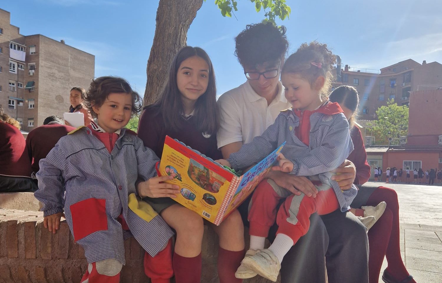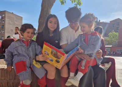 Descubrir que la lectura no tiene edad y que se pueden compartir tantas cosas con un libro en la mano fue uno de los objetivos de esta actividad: Los alumnos de secundaria leyeron cuentos a sus compañeros más pequeños del cole. Fue muy hermoso ver cómo los jóvenes del cole tomaban de la mano a los pequeños y les invitaban a través de los cuentos a recorrer mundos maravillosos